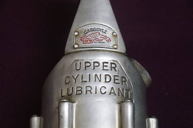 Mobiloil Gargoyle Upper Cylinder Lubricant Cylindrical Dispensing Cabinet with Good Enamel Signs to the Front with Dispensing Gun Inside. 13cm wide x 48cm high