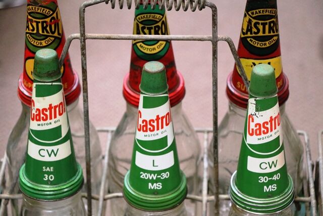 Vintage Castrol Bow Tie Enamel 12 Bottle Oil Rack. Genuine 6 pint & 6 Quart Embossed Bottles, Genuine Tin Tops with Genuine Dust Caps. Enamel sign in very good condition.