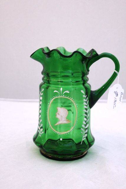 Victorian Green Glass Cameo Jug. Hand Enamel Decorated. 17cm tall