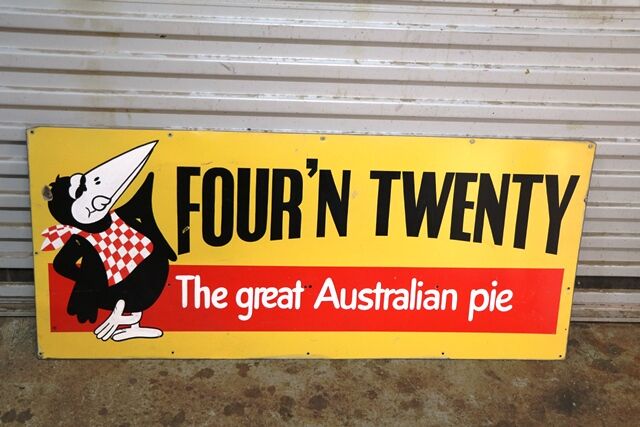 Genuine Screen Print Four & Twenty Pictorial Tin Sign. The Great Australian Pie. 120cm wide x 52cm high.. In very nice original condition.