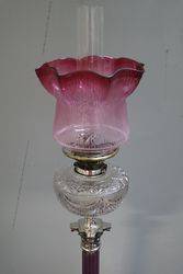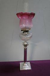 Stunning Antique Banquet Lamp on Silver Plated Corinthian Column . Cut Crystal Font, Ruby Etched Shade & Double Burner. 83cm tall