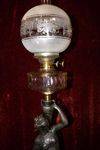 Late Victorian Spelter Female Figure Banquet Lamp, Clear Glass Font Original Double Burner,Period Glass Shade,, 38ins tall.