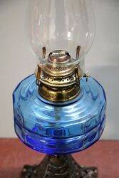 Antique Kerosene Lamp on Cast Iron Base with Blue Glass Font. 45cm high.