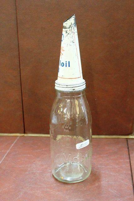 Embossed Mobiloil Quart Oil Bottle With Tin Top